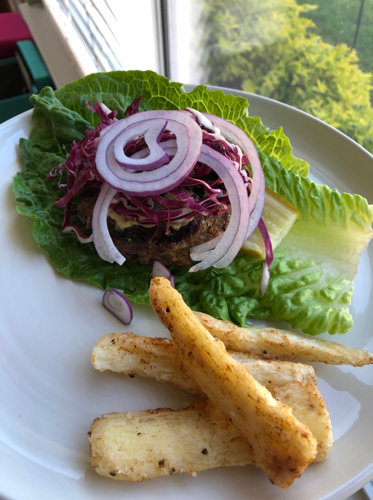After draining my par-boiled yuca, I seasoned with coconut oil, salt, pepper, and berbere spice. Then, I simply baked on 425 F for about 25 minutes until they were crisp and golden. I finished them off with a little sprinkle of salt and lemon juice. It was really quite delicious, a little sweeter and firmer than a potato. It made the perfect prebiotic side to my burger (also topped with onion and radicchio, good prebiotics.)